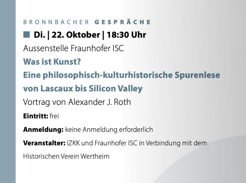 »Was ist Kunst? Eine philosophisch-kulturhistorische Spurenlese von Lascaux bis Silicon Valley«, Vortrag am IZKK und Fraunhofer ISC in Verbindung mit dem Historischen Verein Wertheim, Bronnbach, Oktober 2024. Veranstaltungslink: https://www.kloster-bronnbach.de/Veranstaltungen/Veranstaltungskalender.html?edet=2152