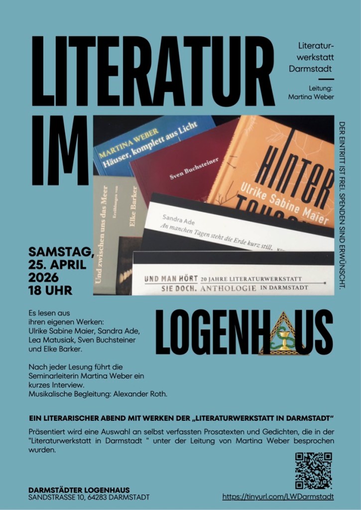 Am Samstag, dem 25. April 2026 findet um 18 Uhr im Moller-Haus Darmstadt die zweite Lesung der »Literaturwerkstatt in Darmstadt« statt: Ulrike Sabine Maier, Sandra Ade, Lea Matusiak, Sven Buchsteiner und Elke Barber tragen aus ihren aktuellen Werken vor, Lyrikerin und Literaturwerkstatt-Leiterin Martina Weber moderiert und geht mit den Autor*innen ins Gespräch. Musikalische Begleitung: Alexander Roth.